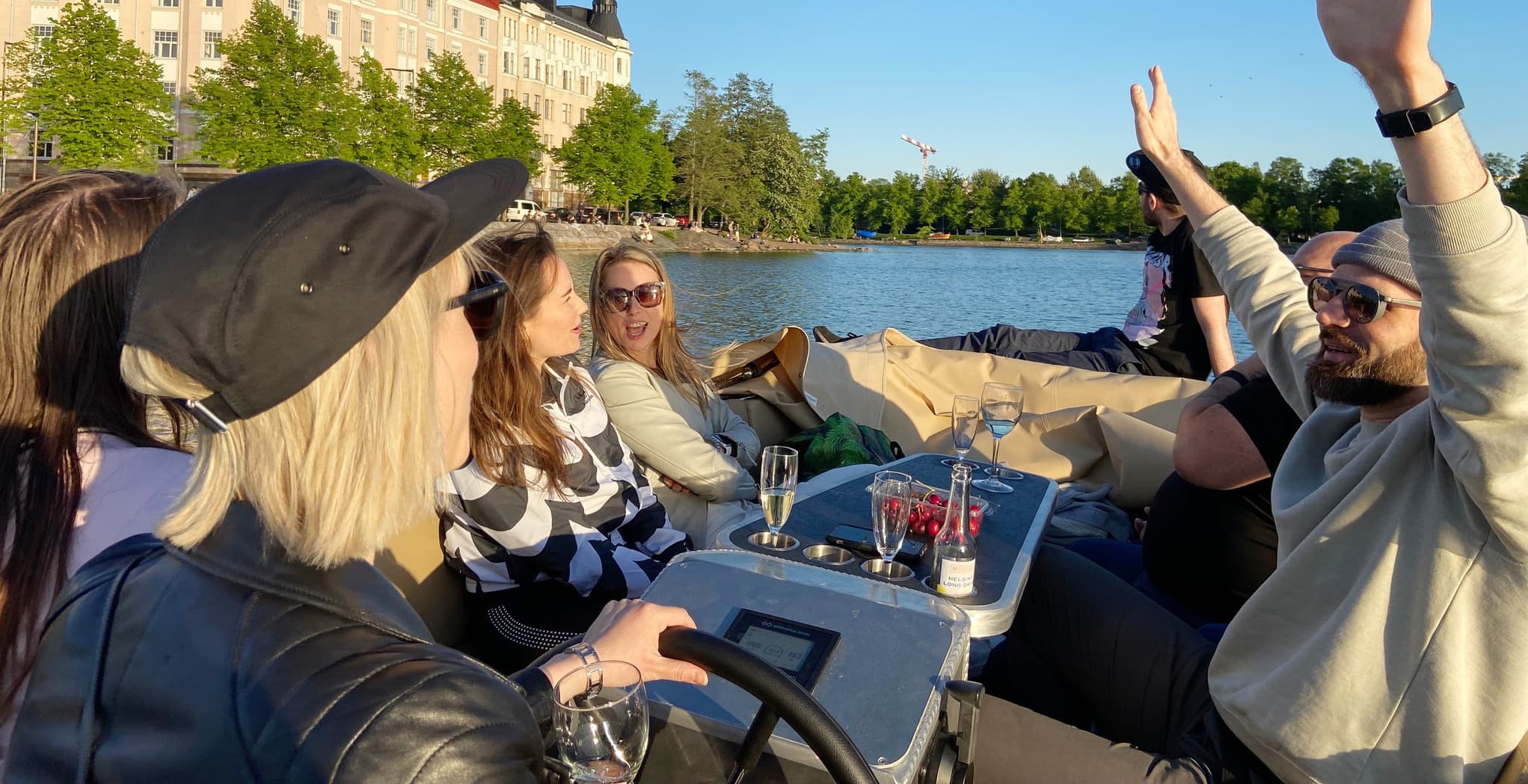 Riittävästi aikaa tutustua merelliseen Helsinkiin kätevästi itseohjattavalla sähköveneellä. Vuokraveneeseen mahtuu enintään 8 henkilöä.